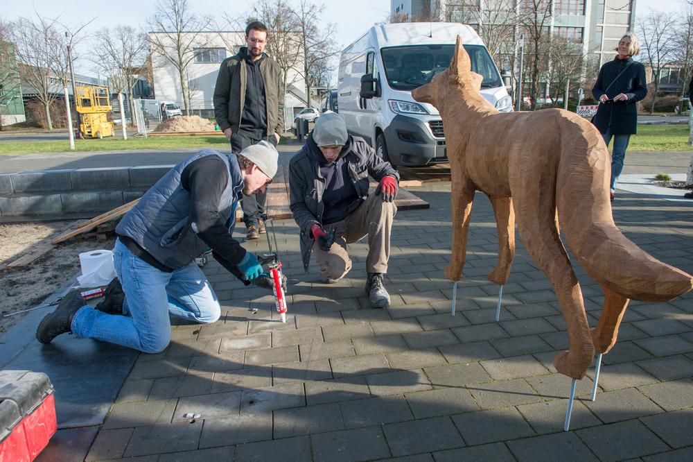 Zur Einweihung kam sogar kurz die Sonne heraus an diesem ansonsten grauen Januar-Morgen. Während Holzbildhauer Sebastian Hertrich gemeinsam mit den Steinmetzen Roland Luchmann und Frederik Frövel den gut 100 Kilogramm schweren Holzkojoten mit Metallstäben im Boden befestigten, erläuterte der Künstler Robert Patz das Konzept seiner Trickster-Figur: Der Trickster (abgeleitet vom englischen Wort „trick“, Betrug, Kniff; Französisch: „tricher“, mogeln, betrügen) ist eine mythologische Figur – ein Schelm, Betrüger, Tölpel – der die göttliche Ordnung bewusst durcheinanderbringt und Regeln in Frage stellt. Sein Kojote, so Patz, verkörpere den „Trickster“, wie ihn die Biologin und Wissenschaftstheoretikerin Donna Haraway versteht: eine Figur, die der Welt entspricht: „Weil die Welt den Fragen der Wissenschaft und dem Streben nach Forschung stets ausweicht. Immer wenn wir etwas entdecken oder Fragen beantworten, entstehen wieder neue Fragen.“