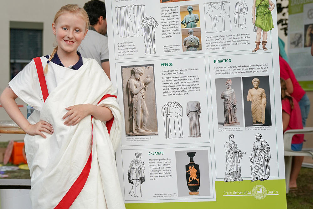 Gut gewandet: Kinderreporterin Gesa auf ihrer Tour durch die Lange Nacht. Im Garten der Topoi-Villa erfuhren die Neunjährige und ihre jüngere Schwester Theda, wie eine Toga fachgerecht gebunden wird.