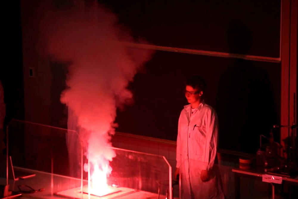 Mit einem Knall ging die „Klügste Nacht des Jahres“ an der Freien Universität zu Ende. „Voll im Element“ war dabei Sebastian Hasenstab-Riedel, Professor für Anorganische Chemie. Gemeinsam mit Studierenden organisierte er Experimente quer durch das Periodensystem. In einem Quiz traten die rechte und die linke Seite des vollbesetzten Hörsaals gegeneinander an. Sobald ein Element anhand seiner Eigenschaften und Verwendungszwecke erraten wurde, folgte ein Versuch. So explodierten mit Wasserstoff gefüllte Ballone, versenkte Natrium Papierschiffe und ließ eine Zigarre, getränkt in flüssigen Sauerstoff, zum krönenden Abschluss goldene Funken sprühen.