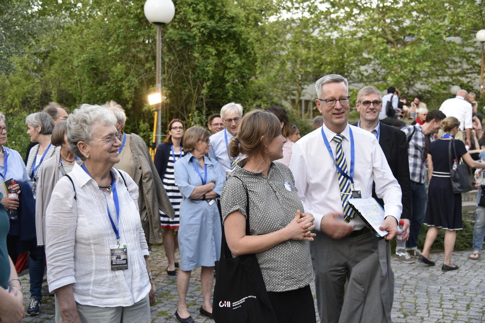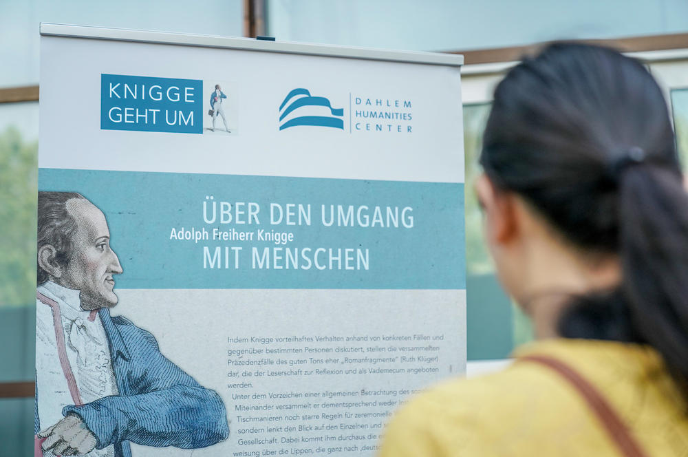 Die Führung endete beim Projekt „Knigge geht um“ am Dahlem Humanities Center. Die Geisteswissenschaftlerinnen und Geisteswissenschaftler regten mit Lesungen und einer Ausstellung dazu an, den 1788 verfassten Klassiker „Über den Umgang mit Menschen“ von Adolph Freiherr Knigge neu zu entdecken. In Kurzvorträgen reflektierten sie über soziale und mediale Verhaltensformen, beispielsweise zu „Höflichkeit − mit und ohne Emojis“.