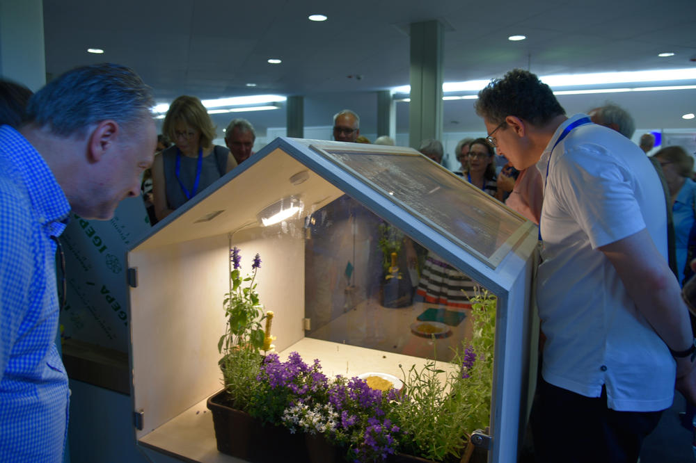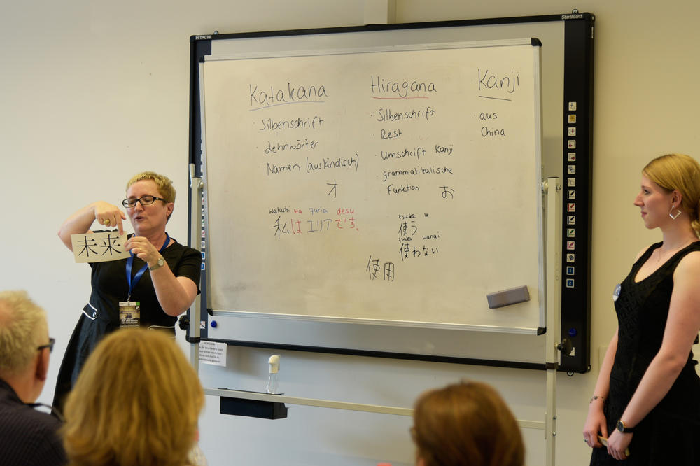 Imkermeister Benedikt Polaczek präsentierte einen Freiflugkasten für Bienen und Hummeln – und konnte so auch zunächst zurückhaltende Besucherinnen und Besucher dank Sicherheitsabstand zum Insektenbeobachten einladen. Nach der Verkostung des hauseigenen Honigs lud Japanologieprofessorin und Vizepräsidentin Verena Blechinger-Talcott nach Japan ein: Bei Mugicha – Gerstentee – und Matcha-Keksen erklärten Studierende die Origami-Faltkunst und zeigten, wie ausländische Namen in Katakana, einem japanischen Schriftsystem, geschrieben werden. „Aus Günter müssen wir leider Ginter machen“, meinte Blechinger-Talcott scherzend zum Präsidenten, „denn ein ‚ü‘ kennt das Japanische nicht.“