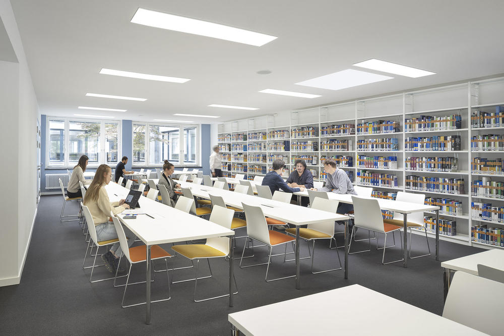 Die insgesamt 360 Arbeitsplätze werden von Bücherregalen gesäumt und sind mit Steckdosen und WLAN ausgestattet. Fenster und Trennverglasungen wurden überarbeitet, neue Fenster sind hinzugekommen und liefern nun üppiges Tageslicht. Auch die neuen Akustikdecken und eine moderne Belüftungsanlage im Korridor verbessern die Aufenthaltsqualität.