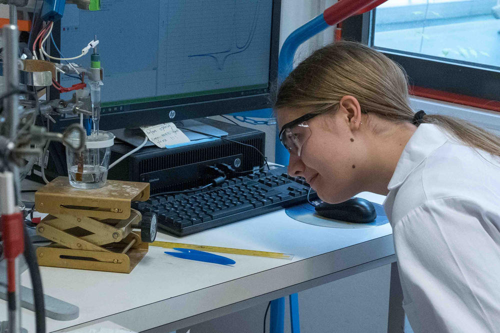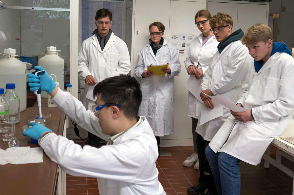 Leif, Paula, Valerie, Tim und Janne sind konzentriert bei der Sache. Die Schüler*innen fertigen im Labor des Physikprofessors Holger Dau Elektrodenfilme an und spalten damit Wasser in Sauerstoff und Wasserstoff. Wenn die Elektroden mit Strom aus erneuerbaren Energiequellen gespeist werden, entsteht „grüner Wasserstoff“, der eine wichtige Rolle in der Energieversorgung der Zukunft spielen soll.