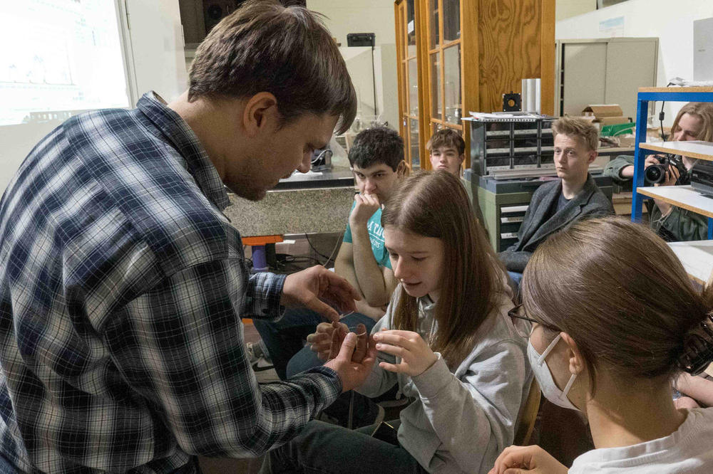 In der Laborhalle des Physikprofessors Karsten Heyne ist eine andere Gruppe dabei, unter Anleitung des wissenschaftlichen Mitarbeiters Gerome Weiland ein Spektroskop zu bauen, Haare zu vermessen und die Geschmacksstoffe aus Gummibärchen in Atemgasen zu identifizieren.