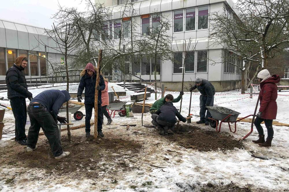Um den betonharten Boden zu belüften, engagierte die Seminagruppe Expert*innen von „Tree of Life“ , die exemplarisch Bodenbohrungen an zwei Bäumen vornahmen und über diese Druckluft hineinpumpten. Das Erdreich wurde so von innen aufgelockert, und zugleich konnte hochwertiger Dünger eingebracht werden. Die angehenden Garten- und Landschaftsplaner der Peter-Lenné-Schule machten sich hochmotiviert daran – unter Berücksichtigung der im Seminar erarbeiteten und als notwendig erkannten Maßnahmen – zwei Pläne zur Neugestaltung der Apfelwiese zu entwickeln. An solch einem konkreten Projekt mitzuarbeiten, sei für die Schüler*innen eine tolle Herausforderung und große Motivation gewesen, sagt Karola Braun-Wanke.
