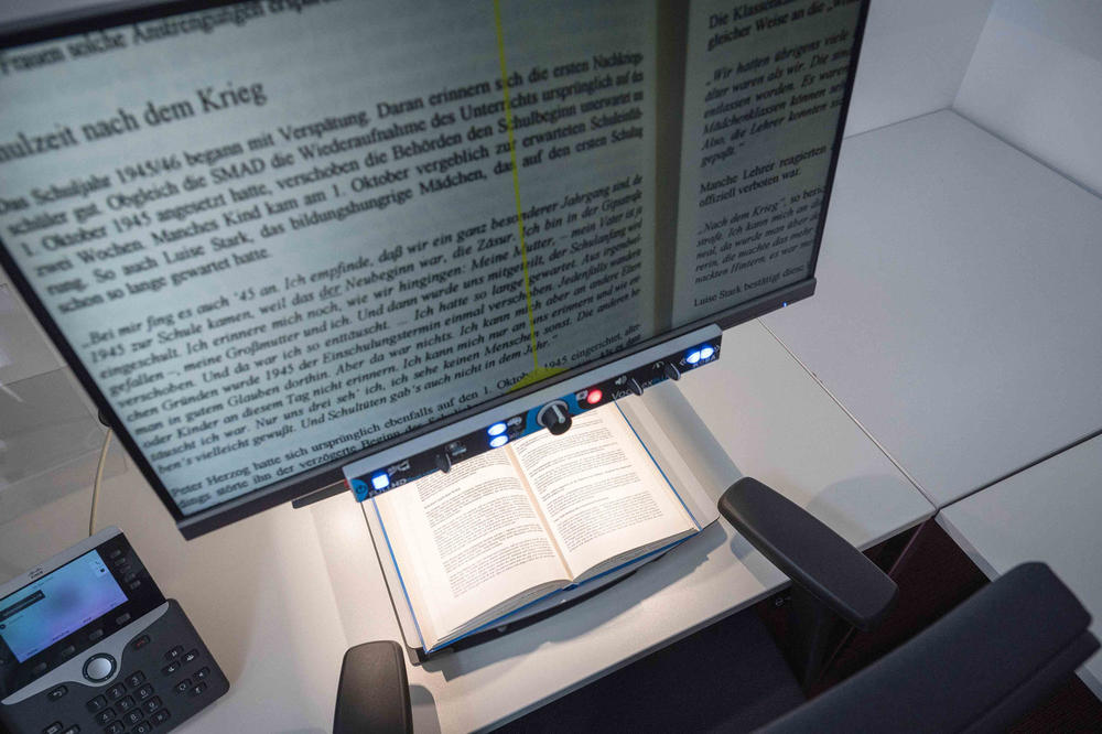 Eine ruhige Umgebung, geeignete Beleuchtung und Blendschutz fördern konzentriertes Arbeiten. Ein Bildschirmlesegerät mit Vorlesefunktion hilft beim Forschen und Lernen und fördert so die gleichberechtigte Teilhabe von Menschen mit Beeinträchtigungen. Zur Ausstattung gehören außerdem ein PC mit mehreren Assistenz-Programmen, eine Tastatur mit großen Buchstaben, ein höhenverstellbarer Schreibtisch, ein Tischscanner, eine Webcam, ein Headset, ein Lautsprecher und ein Arbeitsplatz-Telefon. „Wir freuen uns, dass Studierende mit Beeinträchtigungen in den neuen Arbeitsräumen nun eigenständig ihren Lernprozess gestalten können“, sagt Anja Ahrens.