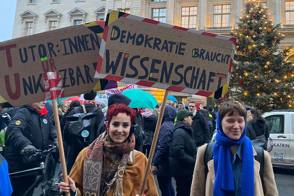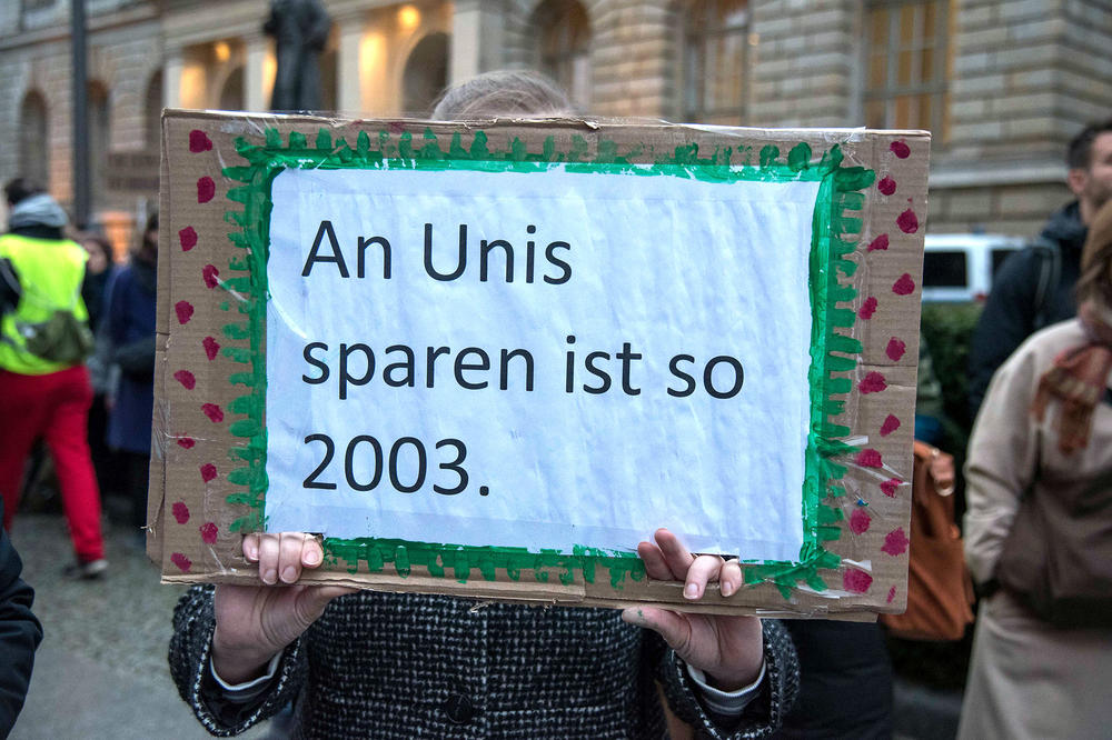Die Proteste richteten sich gegen die Kürzungen bei Hochschulen und in der Wissenschaft. Der Berliner Senat plant, im kommenden Jahr drei Milliarden Euro einzusparen. Auf die Wissenschaftsverwaltung entfallen davon 250 Millionen Euro. Mit den Stimmen der schwarz-roten Koalition wurde der Nachtragshaushalt für 2025 an diesem Donnerstag, 19. Dezember, vom Berliner Abgeordnetenhaus beschlossen.