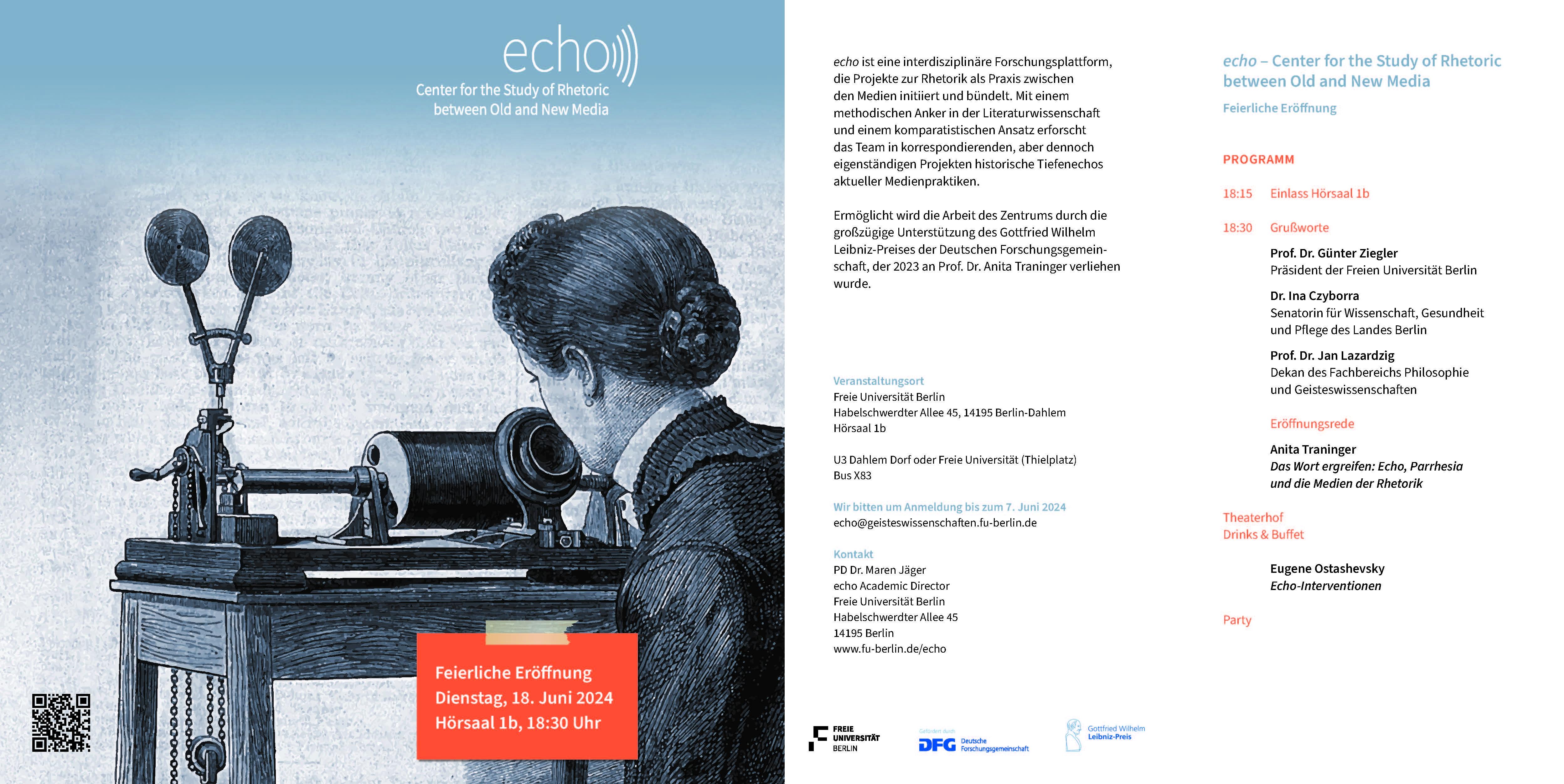 On June 18, 2024, we had the pleasure of welcoming guests from all around the world to celebrate the official inauguration of echo. After remarks were delivered by the president of Freie Universität Berlin, Prof. Dr. Günter M. Ziegler, the Berlin Senator for Science, Health and Care, Dr. Ina Czyborra as well as the Dean of the Department of Philosophy and Humanities, Prof. Dr. Jan Lazardzig, echo Director Anita Traninger held her inaugural lecture entitled "Chiming in. Echo, Parrhesia and the Media of Rhetoric" [Das Wort ergreifen. Echo, Parrhesia und die Medien der Rhetorik]“; the text can be found here. The official part of the event was duly concluded by a wonderful performance of Russian-American academic and poet Eugene Ostashevsky, who playfully riffed on the themes of echo and resonance, including in a sonnet written specifically for the occasion.