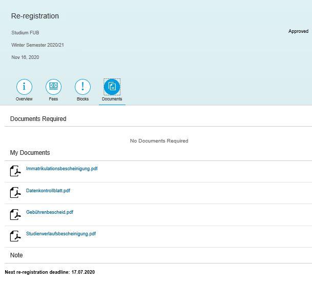 As soon as you have completed all requirements for re-registration, including the payment of your fee for the current semester, the status of your re-registration will change to "approved". After that you will be able to view and download all your documents under the “Documents” tab.