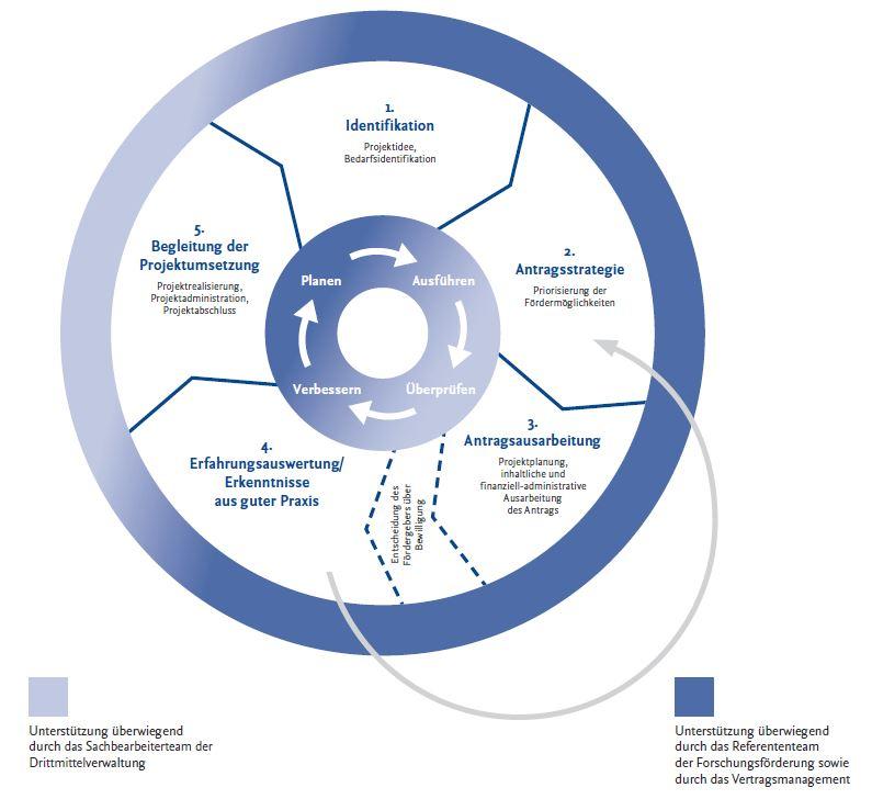 Die Ansprechpartnerinnen und -partner finden Sie hierfür auf dieser Webseite. Die einzelnen Projektphasen mit Unterstützung durch die Teams Forschungsförderung und Drittmittelverwaltung als Grafik