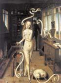 Selbstverständlich steckt Venus in allen Frauen. Deshalb kann man nicht recht sagen, ob es eine heidnische Göttin, eine Fee oder nur ein Mädchen vom Niederrhein ist, das in der rätselhaften Kaminszene des Leipziger Museums (Abb. 11) in seiner Schmuckschatulle ein erstaunlich großes Herz so beträufelt, dass man es mit einer Erdbeere verwechseln könnte. Versonnen blickt sie auf den Liebeszauber, den sie vollführt, während ein junger Mann zur Tür herein tritt. Der Maler selbst spürte, dass seine Kunst nicht ganz ausreichte, das eigentlich Gemeinte und heute auch nicht präzise Gedeutete adäquat auszudrücken. Deshalb wollte er den Beteiligten einzeln das Wort geben. Er hat dafür Spruchbänder in den Raum geschwungen; sie gehen vom Munde der Frau und des Mannes aus, doch das genügt dem Maler nicht. Darüber hinaus sollte nicht nur der Hund, sondern auch das im Schmuckkästchen geborgene, gefangene, versteckte oder prunkende Herz etwas zu sagen haben.