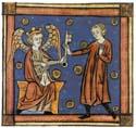 In Liebesdingen ruht im Herzen die eigentliche Entscheidung. Das Herz war für viele der Sitz der Treue und des Charakters. So verwundert es nicht, dass der am weitesten verbreitete erotische Text des hohen Mittelalters mit einer Zeremonie aufwartet, in der dem Liebenden vom Liebesgott das Herz verschlossen wird, damit er nur noch der einen Liebe folgen möge. Das geschieht im französischen Rosenroman von Guillaume de Lorris und Jean de Meun, der um 1228/38 begonnen und um 1268/78 vollendet wurde. In einer frühen Handschrift, die wohl von Berthaud d’Achy vor 1283 geschrieben und illuminiert wurde, wird das Verschließen des Herzens in eine Zeremonie des Schwurs auf den Herzensschlüssel verwandelt (Abb. 5). Da thront der Liebesgott wie ein geflügelter König des 13. Jahrhunderts. Aus einem viel zu kleinen Beutel hat er gerade einen silbernen Riesenschlüssel, wie er dem Heiligen Petrus anstünde, genommen. Amors neuer Gefolgsmann muss zum Gelöbnis an den Stiel fassen; der Text aber beschreibt, wie Amor einen winzigen goldenen Schlüssel nimmt und zum Herzen im Leib damit vordringt, um es körperlich zu verschließen.