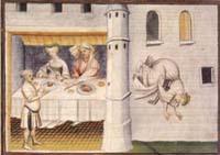 Weniger bekannt wurde die Eifersuchtstat des Guillaume de Roussillon, der seine Frau ähnlich wie im antiken Mythos der Atriden zunächst das Herz ihres Liebsten verspeisen ließ und dann erleben musste, wie sie ihre letzte Kraft zusammennahm, um ihrem Leben ein Ende zu machen. Besonders eindrucksvoll gemalt wurde das um 1415 in Paris (Abb. 6). Maler müssen solche Geschehnisse deutlich darstellen. Deshalb können sie die gemeine List des Mannes nicht verdecken. Das Herz als die übliche Chiffre liegt auf dem Teller, den man der Frau vorsetzt. Dramatisch spitzt sich die Situation durch das Messer in ihrer Hand zu. Die Rolle des Mannes, dem Geflügel serviert wurde, wird noch durch die intensive Weisung mit der Hand unterstützt.