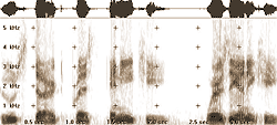 Insbesondere Vokale zeigen eine deutliche Bänderstruktur in dem Spektrogramm. Abbildung 2 zeigt ein Beispiel des Spektrogramms, wenn „e-a-e-a“ ausgesprochen wird. Man sieht die Übergänge von einem Vokal in den anderen, und man sieht deutlich, dass die Formanten sich auf unterschiedlichen Höhen befinden. Das Phänomen des Übergangs der Formanten eines Lautes in den nächsten macht automatische Spracherkennung schwierig, da es nicht immer klar ist, wo ein Laut aufhört und wo der nächste beginnt. Andere Laute, insbesondere solche wie „sch“ und „f“, erzeugen Spektrogramme, die eher wie Rauschen aussehen. Bei Konsonanten ist die Formantenstruktur nicht besonders ausgeprägt.