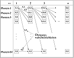 Abbildung 4 zeigt, wie die optimale Lautsequenz ausgewählt wird. Zu jedem Zeitpunkt gibt es eine Mischung von Wahrscheinlichkeiten für jeden Laut. Die Pfeile zeigen an, wie groß die Wahrscheinlichkeit eines Übergangs von einem Laut zu einem anderen ist. Für jeden Zeitpunkt haben wir 64 bedingte Phonem-Wahrscheinlichkeiten. Alle diese 64 Werte werden mit der nächsten Spalte von Phonem-Wahrscheinlichkeiten verbunden, wobei die Wahrscheinlichkeit eines Übergangs als Gewicht jeder Kante notiert wird (nicht alle Verbindungen wurden gezeichnet, um die Abbildung übersichtlich zu halten). Durch die Methoden der dynamischen Programmierung oder anderer passender Algorithmen kann dann der Pfad der maximalen Wahrscheinlichkeit bestimmt werden (schattierte Felder). Dafür ist es wichtig, die Pfade, die verfolgt werden, passend zu segmentieren. Dies kann zum Beispiel durch „silence spotting“ oder „word spotting“ gemacht werden. Wo Pausen erkannt werden, kann der aktuelle Pfad abgebrochen und ein neuer Pfad gestartet werden. Dies verhindert, dass die Pfadwahrscheinlichkeit letztendlich zu stark abnimmt, so dass Alternativen sich nur gering voneinander unterscheiden. Selbstverständlich kann viel mehr Information in die Berechnung eingebracht werden. Mit Hilfe eines Wörterbuches können unsinnige Phonemkombinationen ausgeschlossen werden. Wird noch dazu die Grammatik der Sätze überprüft, können ungrammatikalische Sätze ebenfalls ausgeschlossen werden.