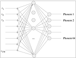 Abbildung 3 zeigt die Architektur eines Netzes, das bei einem an der Universität von Kalifornien entwickelten Spracherkenner zum Einsatz gekommen ist [Bourlard, Morgan 1993]. Die Ausgabe des Netzes besteht aus 64 Ausgabewerten, die anzeigen sollen, welches von 64 Phonemen in das Netz eingegeben wurde. Idealerweise sollte nur eine der Ausgabeleitungen auf Eins schalten, während die anderen „stumm’“ (das heißt bei Null) bleiben. Die Sprachsignale werden segmentiert und von jedem Fenster werden 18 Koeffizienten genommen. Dies können die Amplituden im Spektrogramm sein, wobei nur 18 unterschiedliche Frequenzbereiche berücksichtigt werden. Es können aber auch zusätzliche Transformationen der Sprachsignale durchgeführt werden, die aber für unsere Zwecke unerheblich sind. Jedoch werden in das Netz nicht nur die 18 Koeffizienten eines Fensters eingegeben, sondern auch der „Kontext“ des Signals. Dieser besteht aus den Koeffizienten der sechs Fenster vor und der sechs Fenster nach dem aktuellen Fenster. Dies ergibt insgesamt 13 mal 18, also 234 Eingabewerte für das Netz.