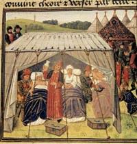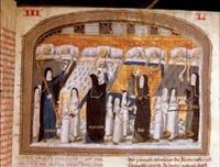 Die vier Tugenden Prudentia, Temperantia, Fortitudo und Justitia unterrichten Nonnen in der Pflege der Kranken. Französische Buchmalerei, 1482/83 |