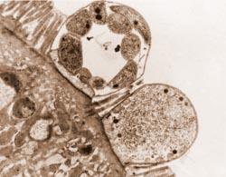 Abbildung 2: transmissionselektronenmikroskopische Aufnahme von Cryptosporidium parvum im Dünndarm eines HIV-infizierten Patienten. |