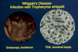 Die Sicherung der Diagnose erfolgt in der Regel durch eine Gewebeprobe aus dem Zwölffingerdarm, in der sich die charakteristischen, in einer Spezialfärbung nachweisbaren (periodic-acid-Shiff-positiven) Einschlüsse in Darmschleimhaut-Makrophagen finden (Abbildung 5: Histologiebild). Diese Einschlüsse entsprechen elektronenmikroskopisch charakteristischen stäbchenförmigen Bakterien (Abbildung 4 rechts: elektronenmikroskopische Aufnahme von T. whippelii). Neuere Daten weisen auf eine weite Verbreitung des Erregers in der Umwelt (z. B. im Trinkwasser und Kläranlagen) und auf eine hohe Prävalenz von ca. 30% bei gesunden Personen hin. Die Seltenheit der Erkrankung ist – bei weiter Verbreitung des Erregers in der Umwelt und offensichtlicher Harmlosigkeit bei den meisten Menschen – möglicherweise mit einem umschriebenen, genetisch determinierten Defekt der zellulären Immunität erklärbar.