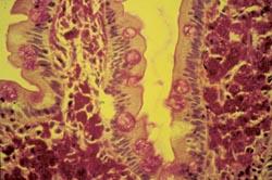 Abbildung 5: Unter dem Mikroskop kann man innerhalb der Dünndarmzotten viele rot gefärbte Strukturen erkennen, die den Bakterien (Tropheryma whippelii) entsprechen. |