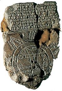 Die so genannte „babylonische Weltkarte“. Fragmentarische Tontafel mit schematischer Zeichnung der Erde und einem beschreibenden Text. |