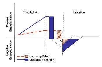 Aus diesem Grund macht jede Milchkuh nach der Geburt des Kalbes eine Periode der negativen Energiebilanz mit (Abbildung oben), in der sie den bestehenden Bedarf aus eigenen Körperreserven (Körperfett, Muskeleiweiß) decken muss. Vor allem diejenigen Kühe, die in der Trockenstehperiode durch übermäßige Fütterung übergewichtig geworden sind, haben Anpassungsschwierigkeiten und sind für Krankheiten anfälliger.