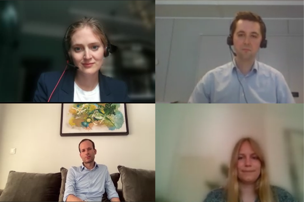 Das Videokonferenz-Format macht es möglich: Zeitgleich sind die Alumni aus vier verschiedenen Orten der Welt zugeschaltet, um ihre Erfahrungen mit den Studierenden in Berlin zu teilen: Julia von einer Dienstreise aus Riga, Lena zwischen zwei Stationen in Amsterdam und Stockholm, Tim aus seinem Büro in Brüssel und Tobias von seinem aktuellen Arbeitsort in Bujumbura.