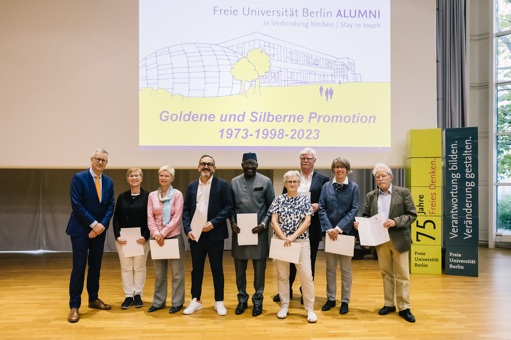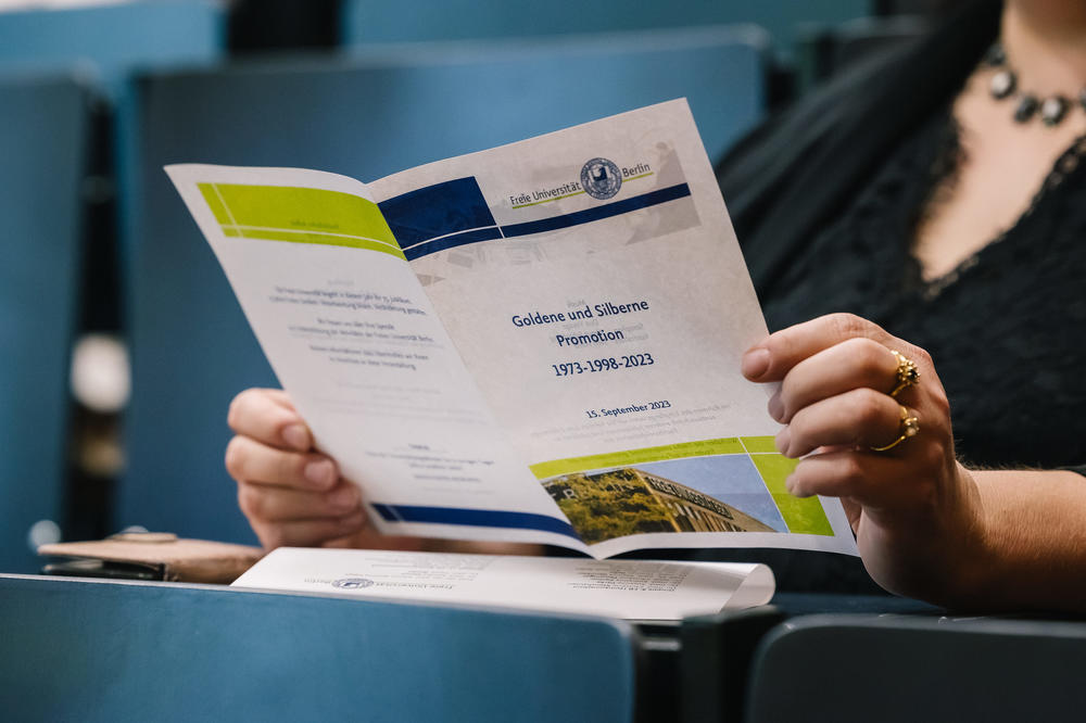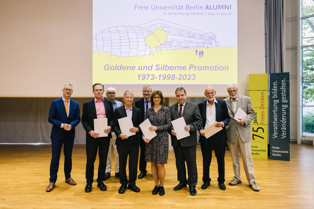 25 plus 50 macht 75 - passend zum 75. Jubiläumsjahr der Freien Universität fand am 15. September 2023 die Feier der Goldenen und Silbernen Promotion 1973 - 1998 - 2023 statt. Der Präsident Professor Dr. Günter M. Ziegler begrüßte die Jubilarinnen und Jubilare im großen Hörsaal in der Rost- und Silberlaube zum Festakt und zur feierlichen Urkundenübergabe.