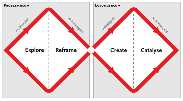 Die erste Raute steht für die eingehende Auseinandersetzung mit der initialen Problemstellung („Problemraum”); die zweite Raute repräsentiert die Phase, in der neue Lösungen entwickelt und erprobt werden („Lösungsraum”). Das bedeutet: Erst versuchen wir ein Problem umfassend aus verschiedenen Perspektiven zu verstehen. Dann entwickeln und erproben wir gemeinsam neue Lösungen. Die Doppelraute illustriert darüber hinaus auch den wiederholten Wechsel von divergentem und konvergentem Denken. Während es beim divergenten Denken darum geht, den Blick für möglichst viele Perspektiven oder Ideen zu öffnen, zielt konvergentes Denken auf Eingrenzung und Fokussierung auf ausgewählte Handlungsfelder und Lösungsansätze.