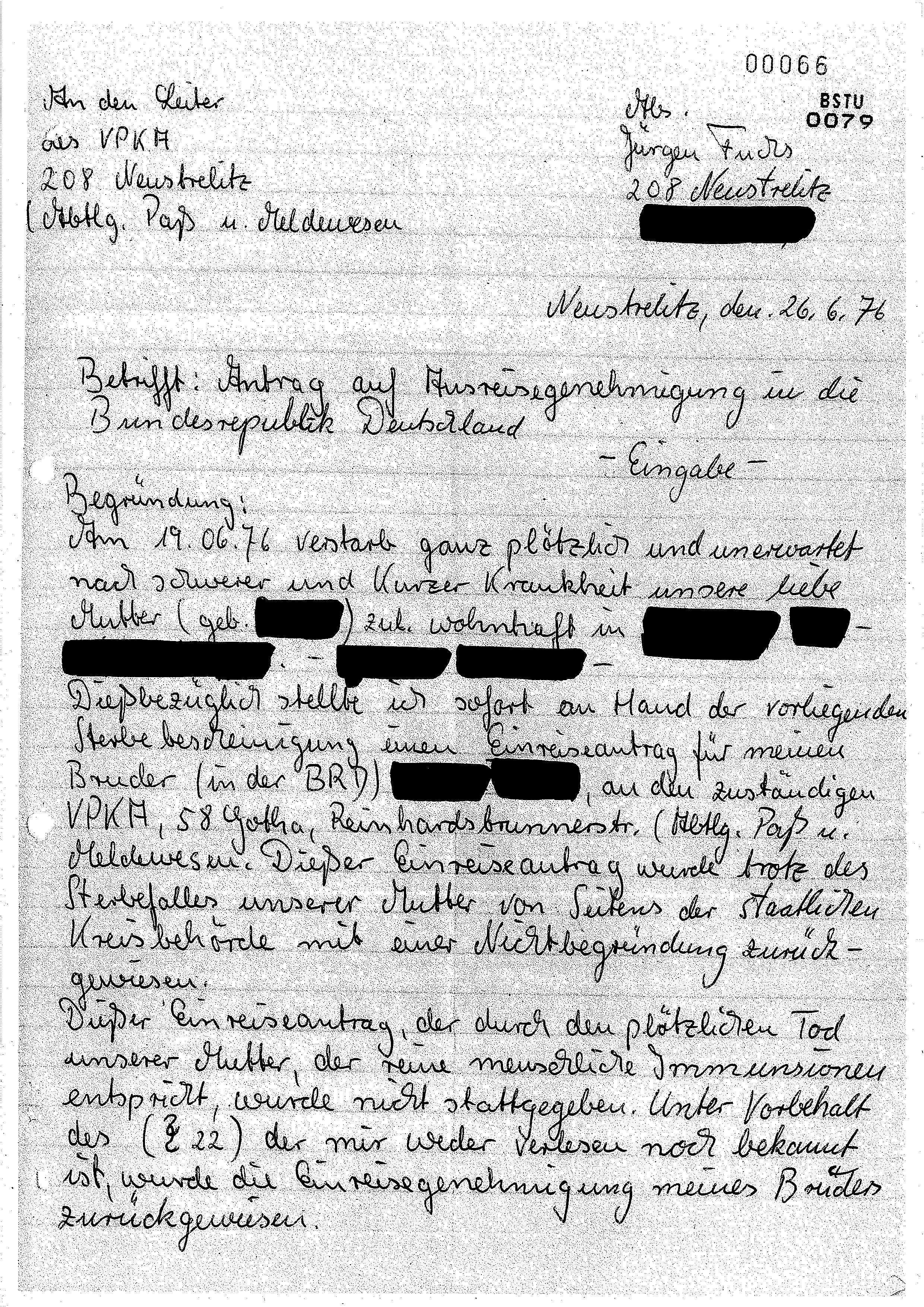 Als im Juni 1976 nach kurzer schwerer Krankheit seine Mutter starb, verweigerte die DDR seinem in Westdeutschland lebenden Bruder die Einreise zur Beisetzung. Daraufhin stellte Jürgen Fuchs einen Ausreiseantrag. Darin berief er sich auf Erich Honeckers Rede auf dem 8. Parteitag der SED, in der dieser versprach, die Partei werde „Erscheinungen von Herzlosigkeit und Bürokratismus – wo immer sie auch auftreten – entschieden bekämpfen”. Mit der Weigerung der Behörden, seinen Bruder zur Beerdigung der Mutter in die DDR einreisen zu lassen, seien „all die guten Vorsätze, die ich mir für die Zukunft gestellt habe” durch die „so unmenschlichen und unmoralischen Verhaltensweisen von Seiten der staatlichen Behörde nun völlig zerstört”. Am 16. Juli 1976 suchte Jürgen Fuchs die Lokalredaktion der SED-Bezirkszeitung Freie Erde auf und bat um die Veröffentlichung eines Artikels, in dem er die gegen seinen Bruder verhängte Einreisesperre kritisierte. Man verwies ihn des Hauses und informierte den Staatssicherheitsdienst. Dessen Kreisdienststelle Neustrelitz überwachte Fuchs seit Mai 1976 in einer „Operativen Personenkontrolle” (OPK). Aus abgefangenen Briefen und durch den Verrat einer Freundin wusste die Stasi, dass Fuchs zur Flucht aus der DDR entschlossen war, falls sein Ausreiseantrag abgelehnt würde. Nachdem man ihn fast zwei Monate im Ungewissen ließ, schrieb Fuchs an die Redaktion des ZDF-Magazins und bat um Unterstützung. Aus Protest gegen die Behördenschikanen verweigerte er am 17. Oktober 1976 die Stimmabgabe zur Volkskammerwahl. Als ihm Anfang November 1976 die Ablehnung seines Ausreiseantrages zuging, stellte er umgehend einen erneuten Antrag auf Übersiedlung in die Bundesrepublik. Am 7. Dezember 1976 erschien Jürgen Fuchs in der Neustrelitzer Behörde für das „Paß- und Meldewesen” und erklärte in erregtem Ton, er wolle nun „sich selbst die Staatsbürgerschaft der DDR aberkennen” und alle seinen Personalunterlagen zurückgeben. Es gelang dann den Behördenmitarbeitern offenbar, Fuchs zu beruhigen und auf die weitere Bearbeitung seines Übersiedlungsantrages zu vertrösten.
