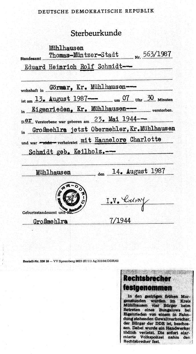 Die Zentrale Auskunfts- und Informationsgruppe des DDR-Staatssicherheitsdienstes meldete am 17. August 1987 in ihrer internen Wochenübersicht Nr. 33/87 über „gegnerische Aktivitäten anläßlich des 26. Jahrestages der Errichtung des antifaschistischen Schutzwalls am 13. August 1961 und damit im Zusammenhang stehende Vorkommnisse im Inneren der DDR” ohne Namensangabe einen „Mord an einem Bürger der DDR durch einen Unteroffizier der NVA”. Beim Getöteten handelte es sich um Rolf Schmidt.