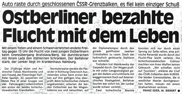 Die beiden Berliner Freunde Ralph-Peter Saurien und Tobias M. hatten sich laut Presseberichten bereits seit Längerem vergeblich um eine Übersiedlung in den Westen bemüht. Im April 1989 entschlossen sie sich schließlich zur Flucht über die ČSSR nach Österreich. Saurien war von Beruf Fliesenleger, eine Familie hatte der 21-Jährige noch nicht gegründet. Weil die Volkspolizei ihm die Fahrerlaubnis entzogen hatte, fuhr Tobias M. Sauriens Lada. Das Fluchtfahrzeug passierte den ersten verkehrsbedingt geöffneten Schlagbaum, wechselte dann auf die Diplomatenspur und durchbrach den zwischenzeitlich geschlossenen zweiten Schlagbaum. Dabei wurde das Dach des Wagens abgerissen. Das schwer beschädigte Auto schlitterte auf die österreichische Seite. Dort konnte Ralph-Peter Saurien nur noch tot geborgen werden. Sein Freund Tobias M. hatte schwere Verletzungen erlitten. Die Wiener DDR-Botschaft sorgte für die Überführung der sterblichen Überreste Ralph-Peter Sauriens nach Ost-Berlin. Die Beisetzung seiner Urne erfolgte auf dem Friedhof in Biesdorf. (Recherche jk, jos, MP, MS, TP; Autor: jos)