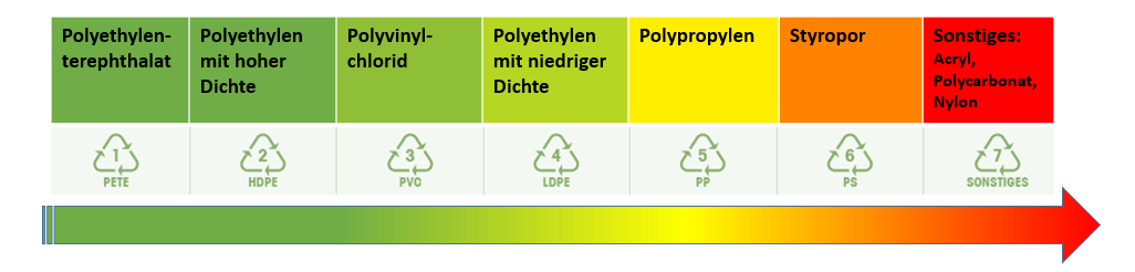 - Verwenden Sie bevorzugt Glasgeräte, vermeiden Sie den Verbrauch von Einwegkunststoff und führen Sie die Kunststoffe dem Recyclingkreislauf zu. Eine Übersicht zu den wiederverwertbaren Kunststoffen von gut (grün) zu schlecht (rot) finden Sie hier.