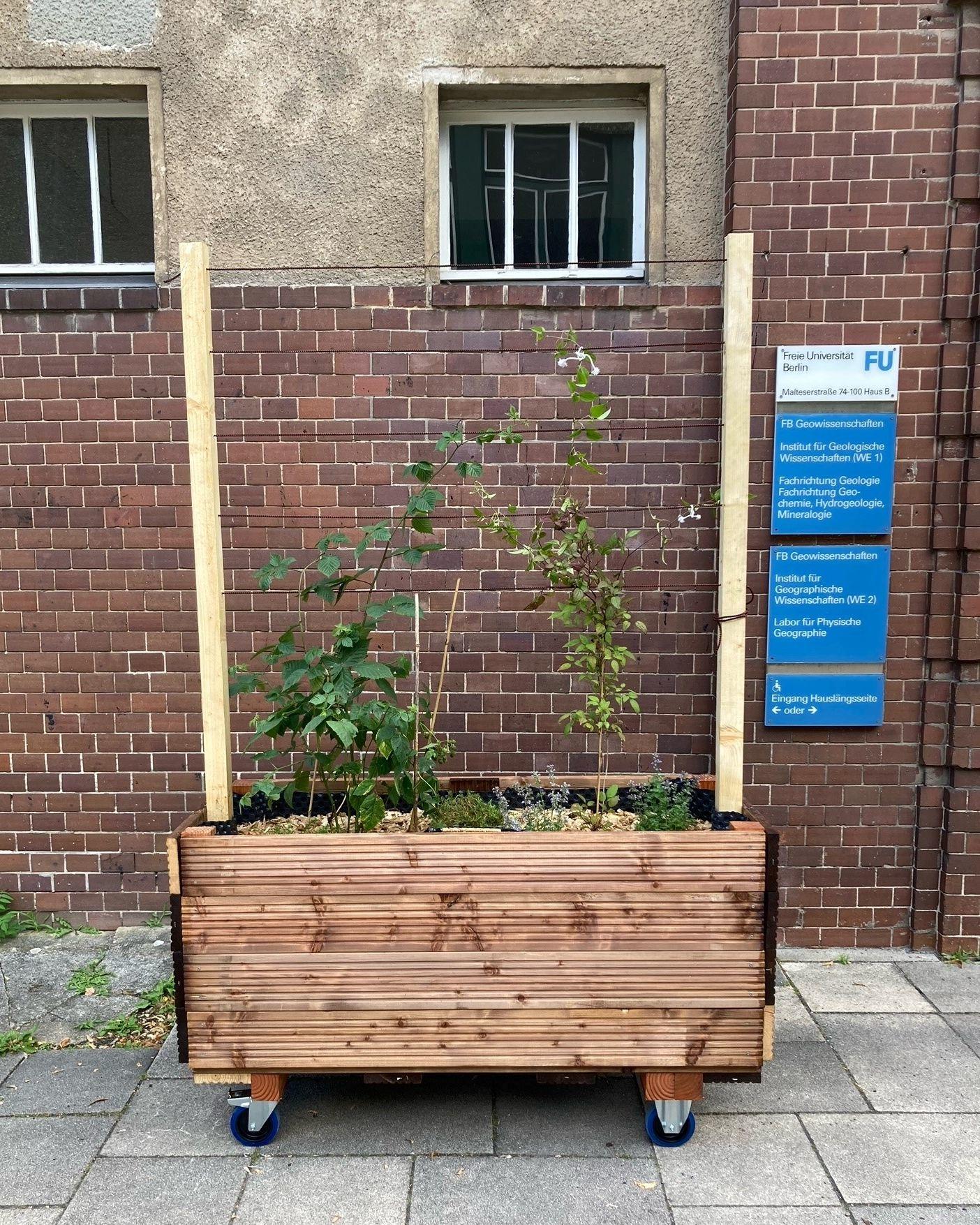 Unsere Kernidee hat sich geändert und wir entwickelten einen mobilen Rankkasten. Dieser ist beweglich, was den Vorteil hat, einen optimalen Standort für das Heranwachsen der Pflanzen und die Nutzung durch Studierende zu erproben. Der Kasten wird perspektivisch im Sommer Schatten spenden, als Rückzugsort und Nahrungsquelle für Insekten dienen und den Campus Lankwitz verschönern.