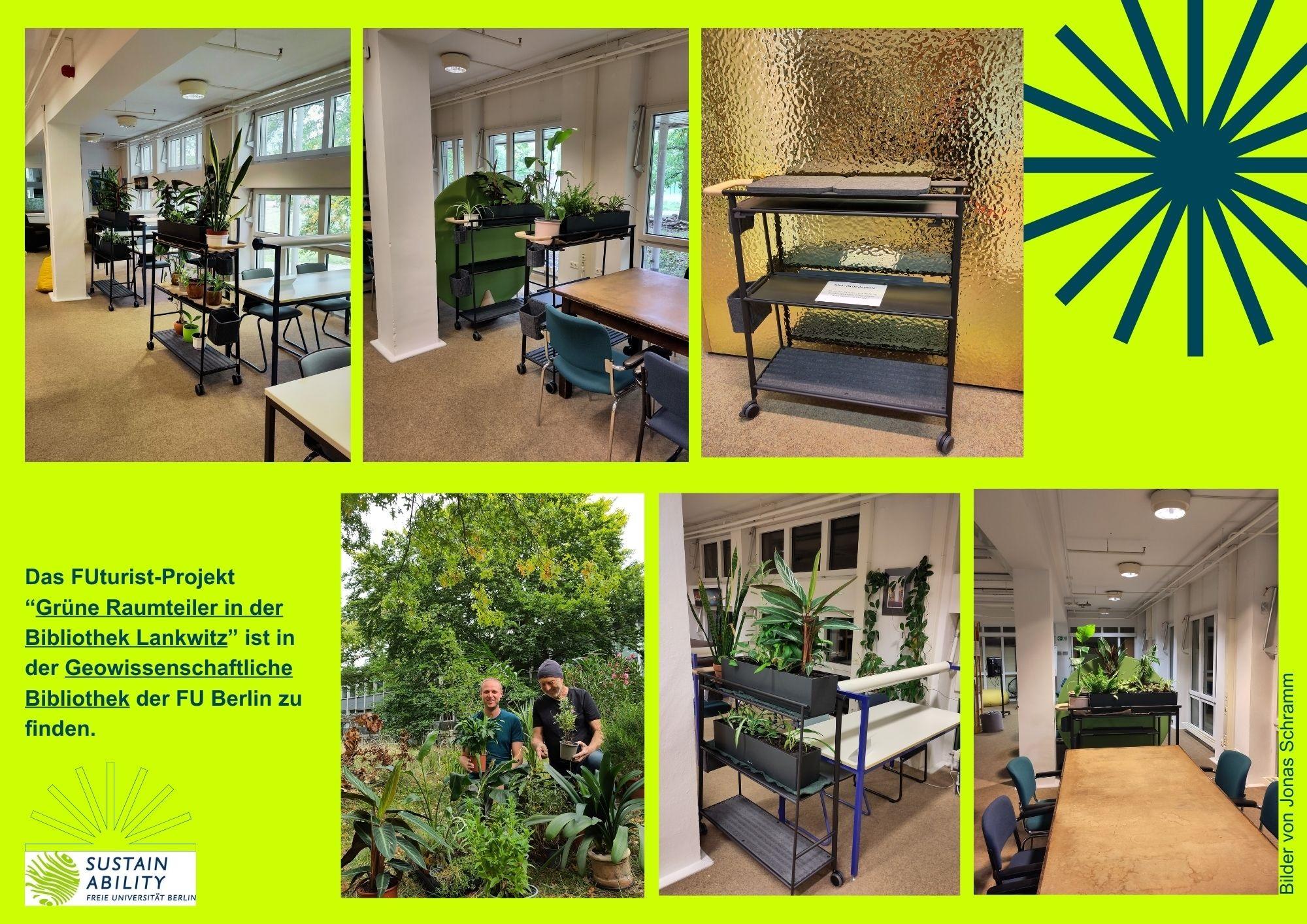Wie das aussehen kann, zeigt diese Collage mit Bildern der angeschaften Raumteiler aus der Campus-Bibliothek in Lankwitz. Mit den Raumteilern kann nun eine Benutzungsforschung durchgeführt werden.