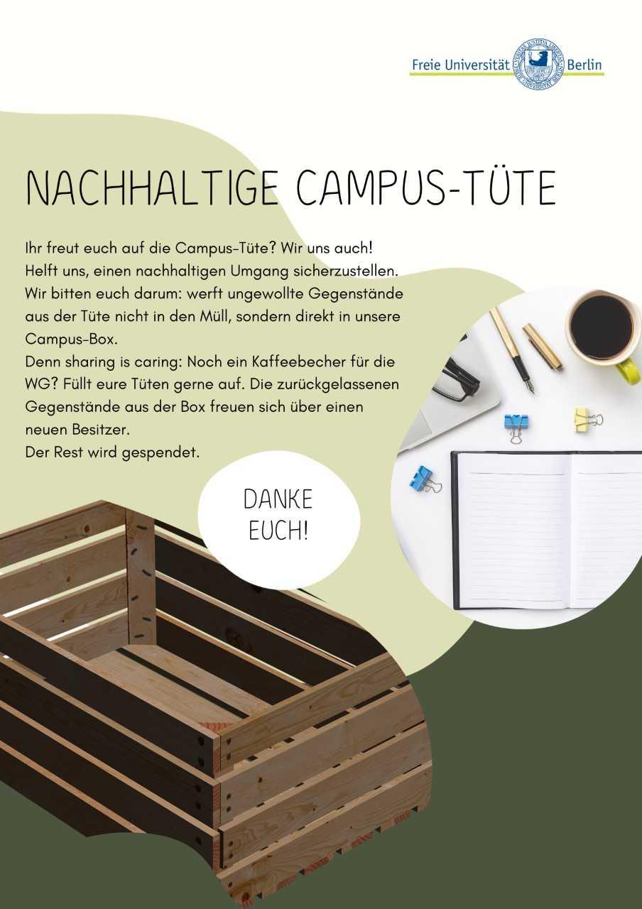 Die erste Idee versucht, der zunehmenden Anhäufung von Müll durch eine "Campus-Box" entgegenzuwirken. Ziel der Box ist es, dass dort ungebrauchte Produkte aus der Campus-Tüte hineingelegt werden können, damit diese nicht im Müll landen. Zugleich können andere Studierende die Produkte aus der Box für ihre eigene Campus-Tüte mitnehmen, getreu dem Motto "Sharing is caring".