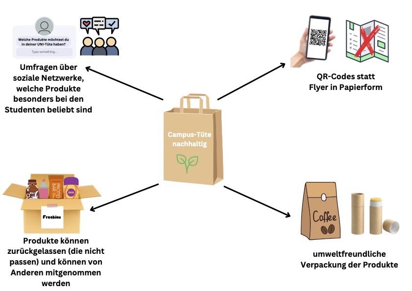Die dritte Idee verfolgt einen ganzheitlich nachhaltigen Ansatz. Nicht nur sollen die Produkte in der Campus-Tüte möglichst nachhaltig sein; sie sollen auch über einen möglichst langen Zeitraum nutzbar sein. Darüber hinaus soll u.a. darauf geachtet werden, dass auch die Verpackung der Produkte möglichst nachhaltig ist. Durch QR-Codes soll zudem die Menge an Flyern in der Tüte reduziert werden. Auch die Idee der "Spenden-Box" wird hier erneut aufgegriffen.