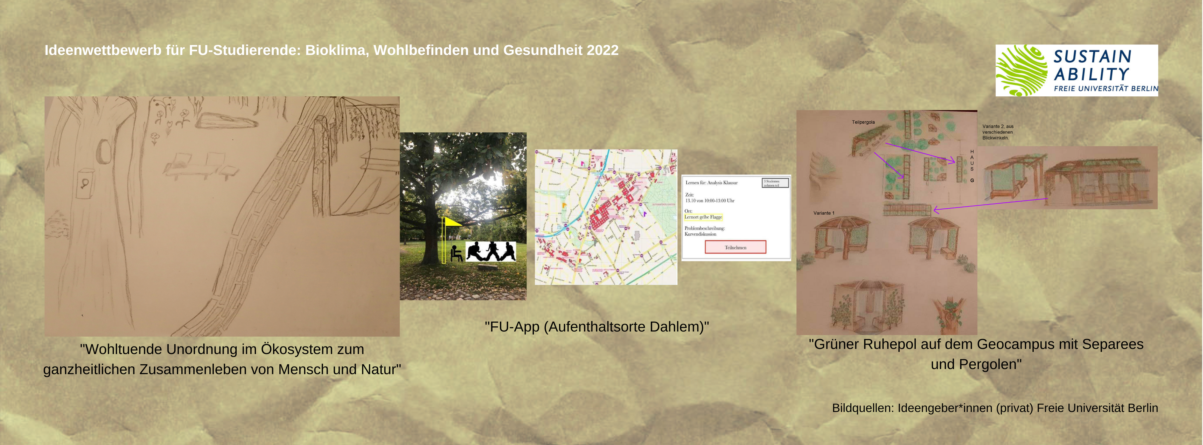 Berlin wird mittel- und langfristig wärmer. Im Hinblick auf Bioklima, Gesundheit und Wohlbefinden suchten wir beim ersten Wettbewerb in 2022 Ideen zur Klimaanpassung für Aufenthaltsorte im Außenbereich von Lankwitz, Düppel oder Dahlem, die zum Lernen und Erholen einladen sollten. Drei Bewerber*innen haben eine Masterclass - Stiftung Entrepreneurship gewonnen, wo sie ihre Ideen weiterentwickeln konnten.