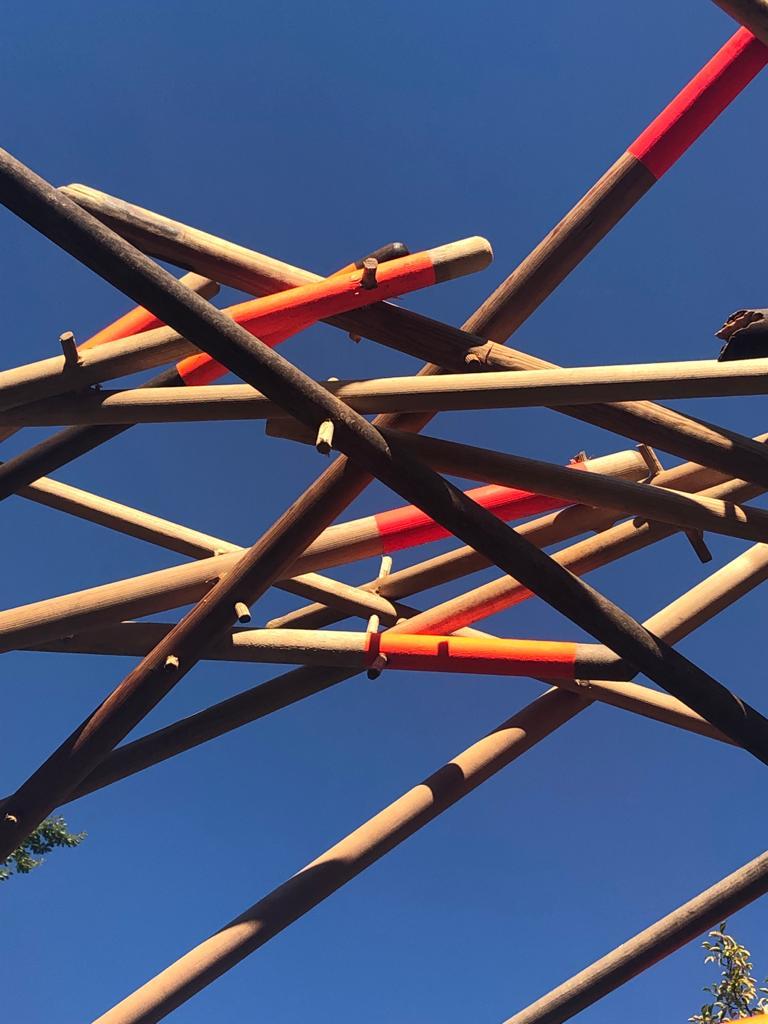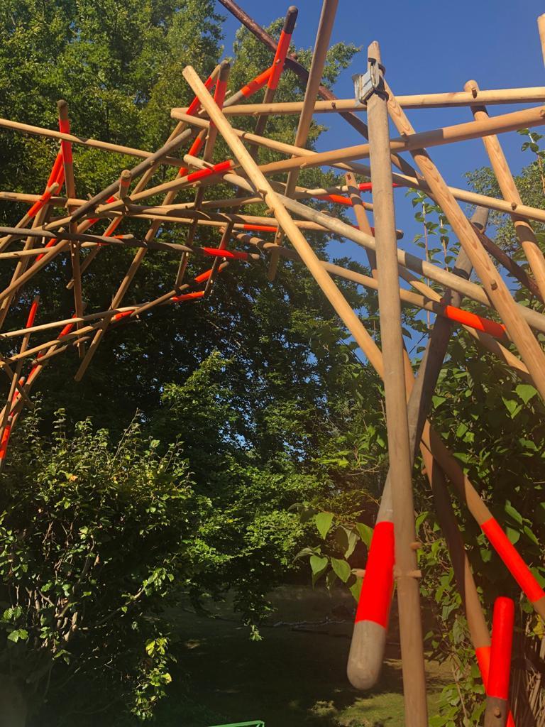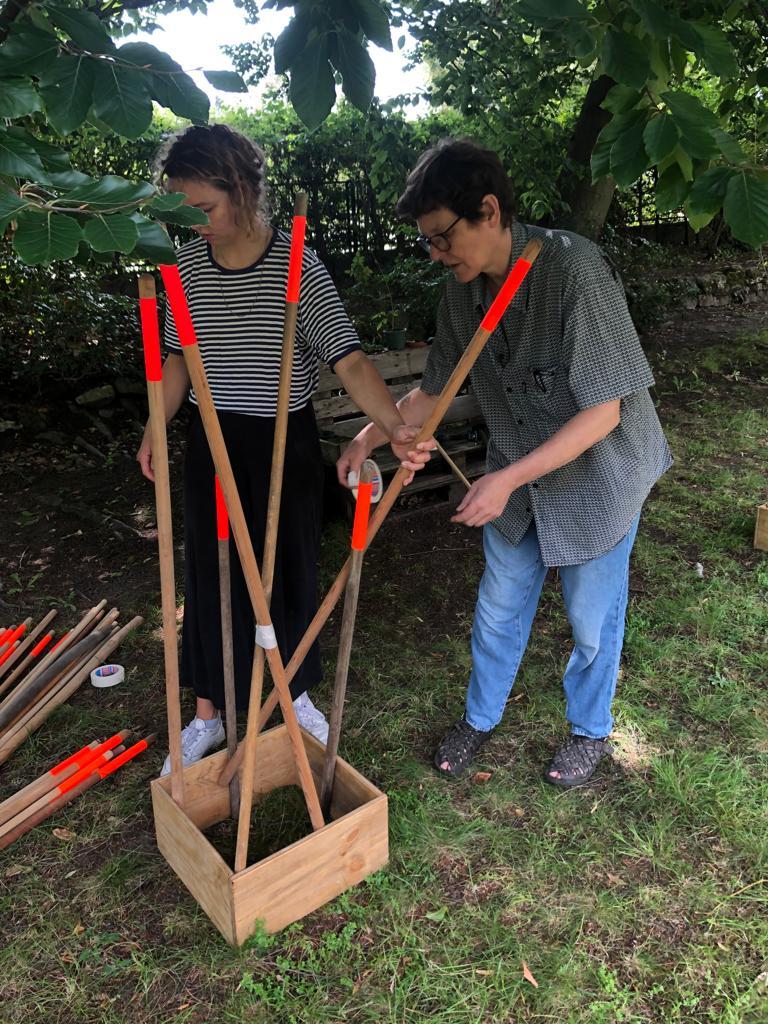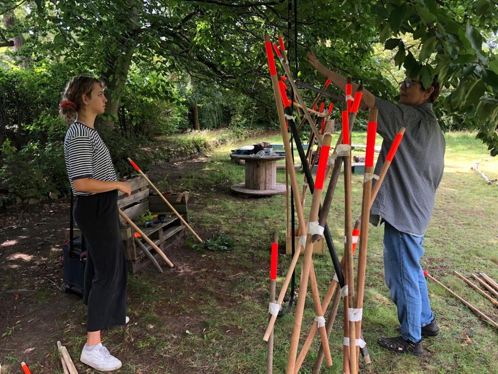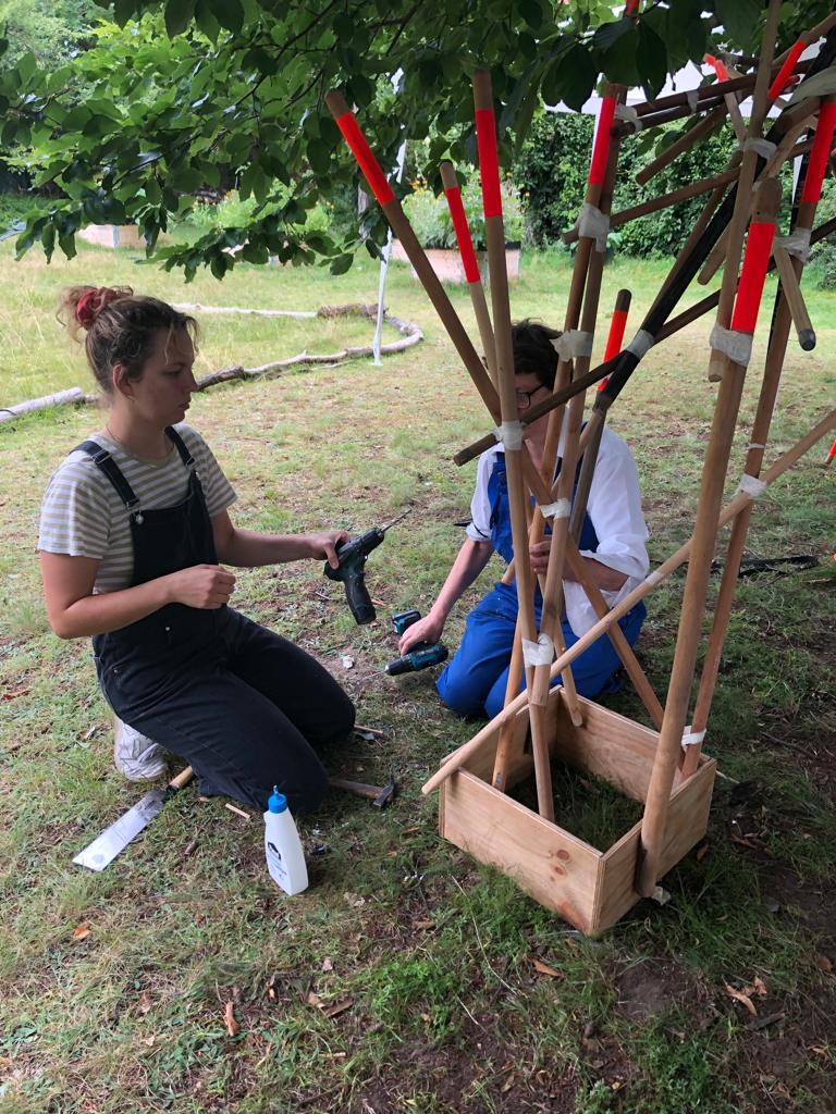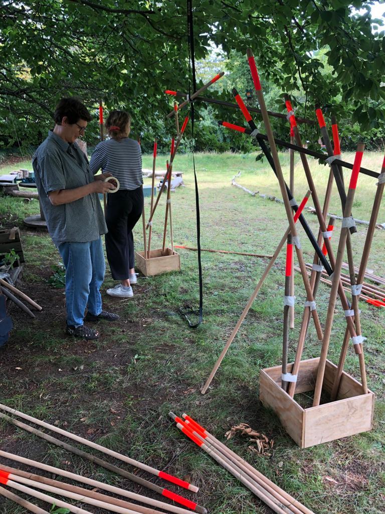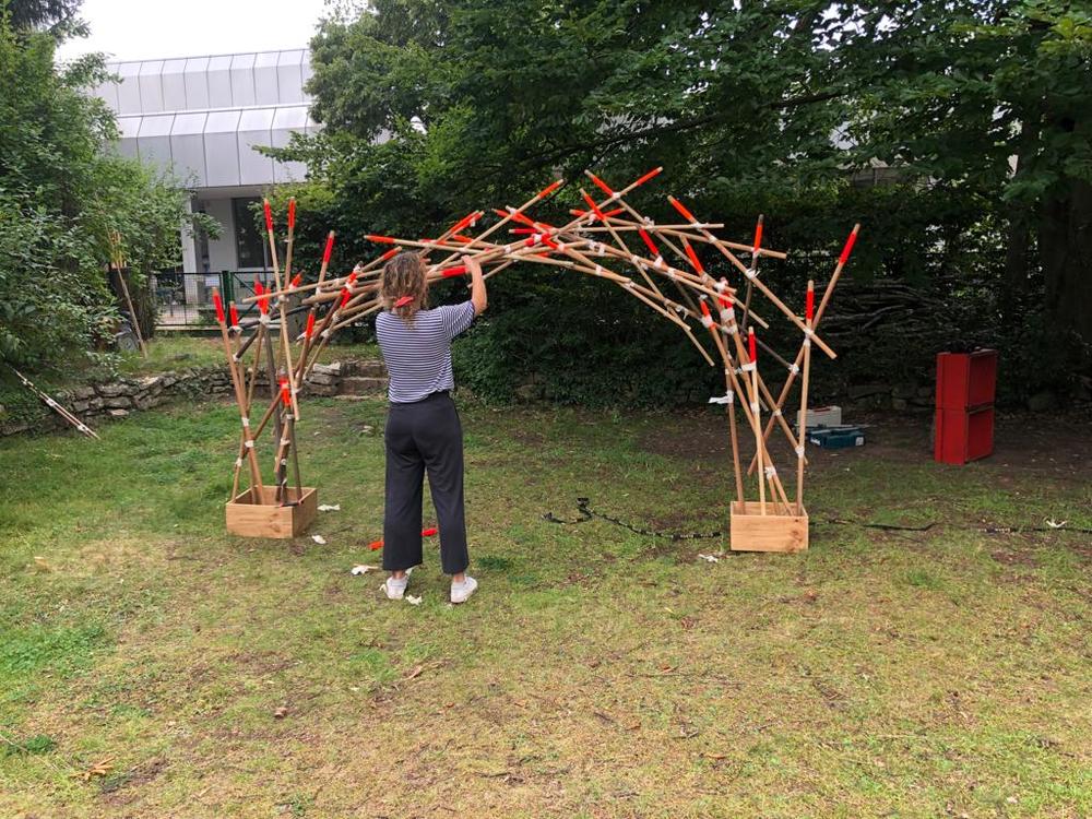 Die Rauminstallation setzt sich aus 53 neuen und alten Besenstielen zusammen. Diese schafft einen räumlichen Dialog zwischen dem etwas versteckten Garten, unserer Universität, dem Kino und der Nachbarschaft. Die Besen wurden spalierartig zusammengesetzt und in den Himmel gehoben. Im Zusammenspiel der unterschiedlichen Besenstiellängen, der krummen und geraden Formen, der Holztexturen und Farbe entsteht eine rhythmische Bewegung. Diese lädt ein, neugierig einzutreten und den Garten in all seiner wilden Vielfalt zu entdecken.