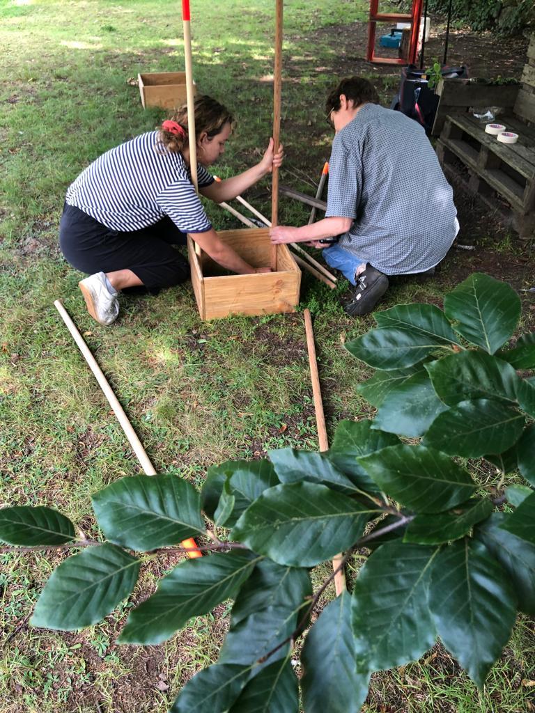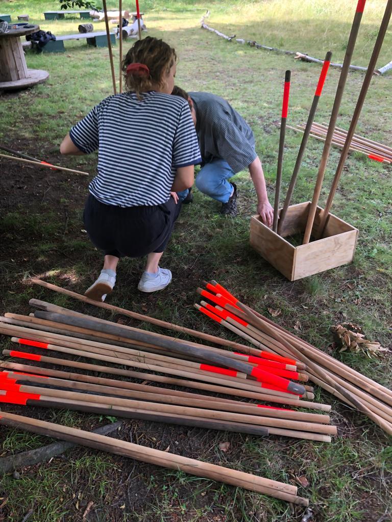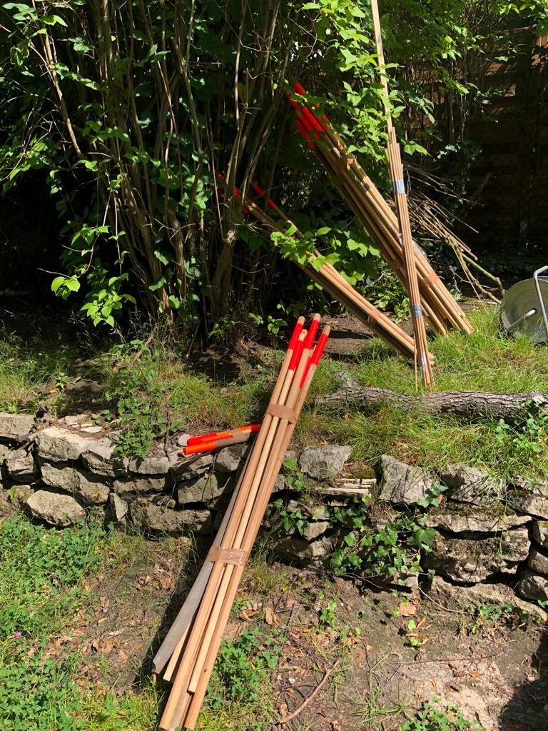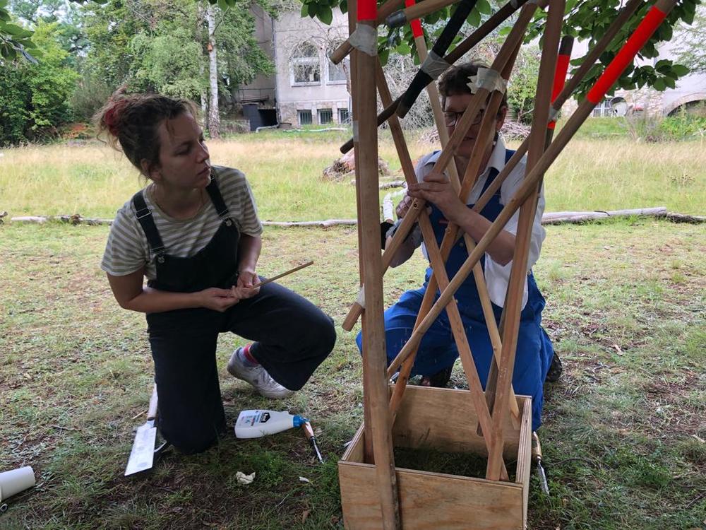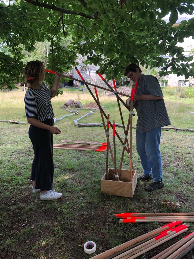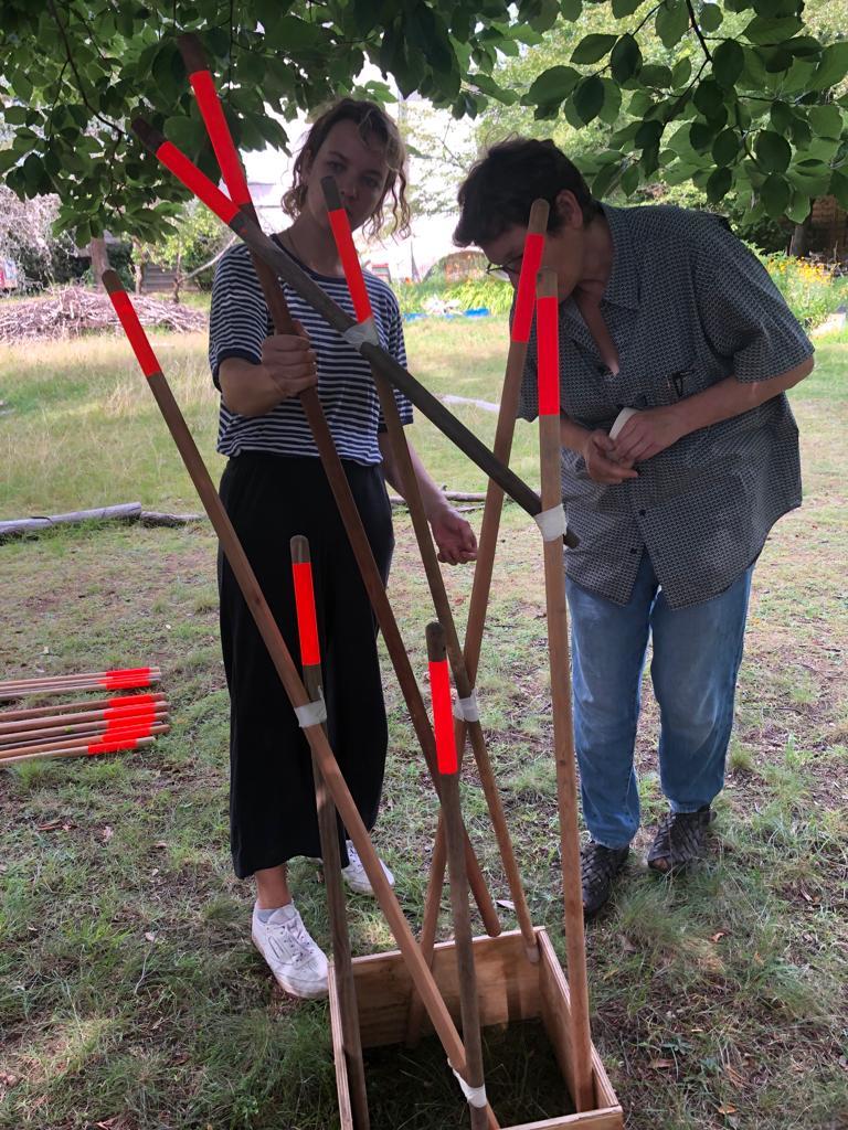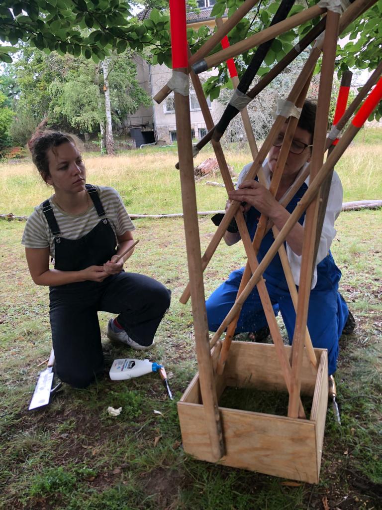 Die Rauminstallation setzt sich aus 53 neuen und alten Besenstielen zusammen. Diese schafft einen räumlichen Dialog zwischen dem etwas versteckten Garten, unserer Universität, dem Kino und der Nachbarschaft. Die Besen wurden spalierartig zusammengesetzt und in den Himmel gehoben. Im Zusammenspiel der unterschiedlichen Besenstiellängen, der krummen und geraden Formen, der Holztexturen und Farbe entsteht eine rhythmische Bewegung. Diese lädt ein, neugierig einzutreten und den Garten in all seiner wilden Vielfalt zu entdecken.