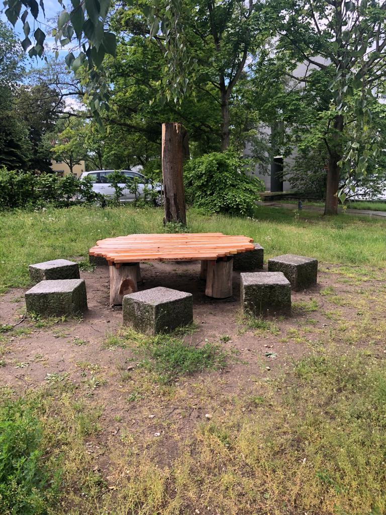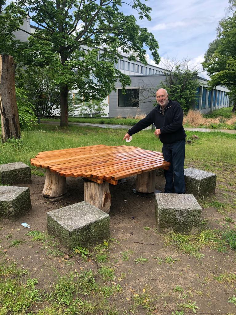 Zudem sind alle herzlich eingeladen, an unserem selbstgebauten Tisch aus Altholz zu verweilen und dem Gezwitscher und Gesumme zu lauschen.