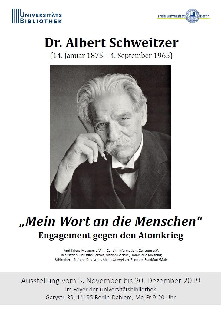 Das Engagement Dr. Albert Schweitzers gegen den Atomkrieg steht im Zentrum einer Ausstellung in der Universitätsbibliothek der Freien Universität Berlin. Im Oktober 1953 wurde dem Arzt, Philosophen und Theologen der Friedensnobelpreis zuerkannt. Schweitzers Ansprache `Mein Wort an die Menschen` (1964), ist als Tondokument in der Ausstellung nachzuhören; er spricht es wie ein Testament an die Zeitgenossen und Nachgeborenen. Ausgestellt werden zudem Informationsplakate, Fotografien sowie Publikationen und Schriften von Albert Schweitzer aus dem Bestand der Bibliotheken der Freien Universität. Außerdem erscheint ein Ausstellungsführer, dessen digitale Version demnächst auf dem Dokumentenserver der Freien Universität Berlin (Refubium) abrufbar sein wird.